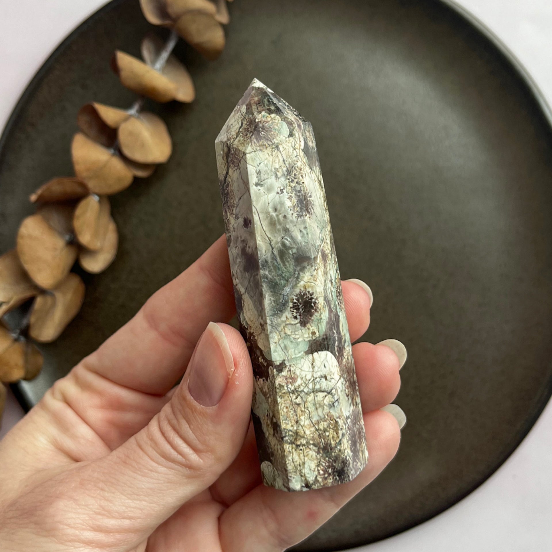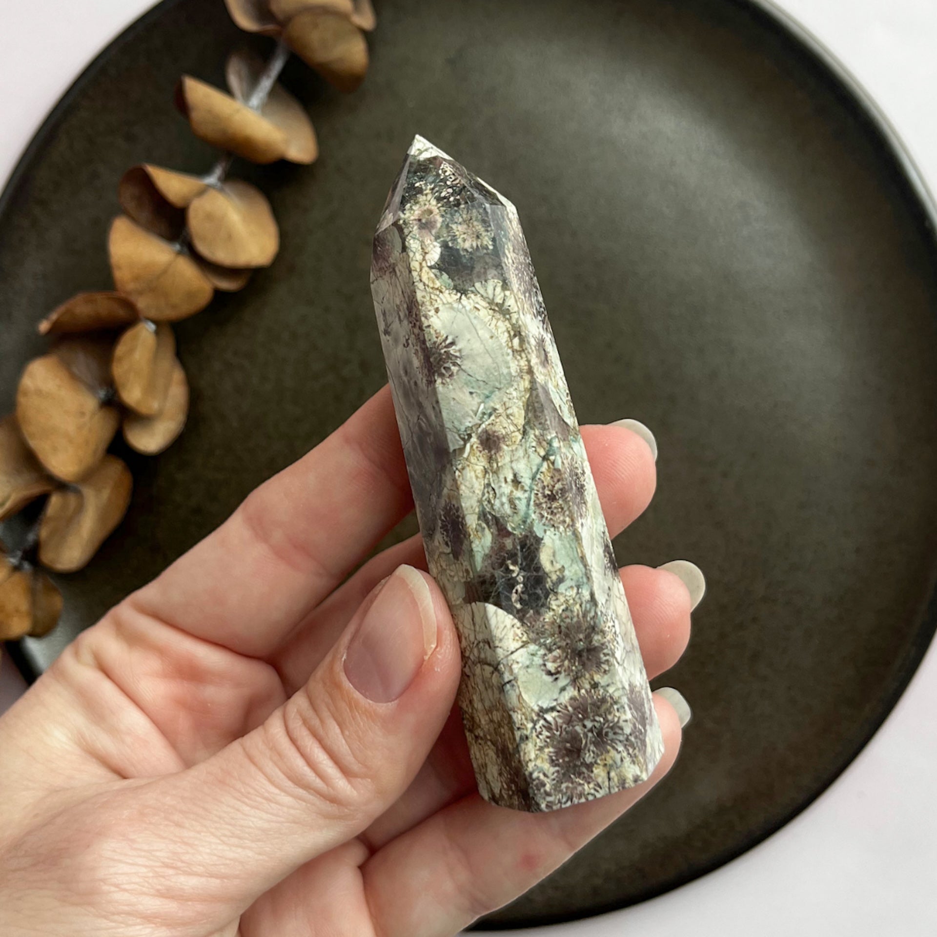 Grøn blomster agat krystaltårn (nr. 4)