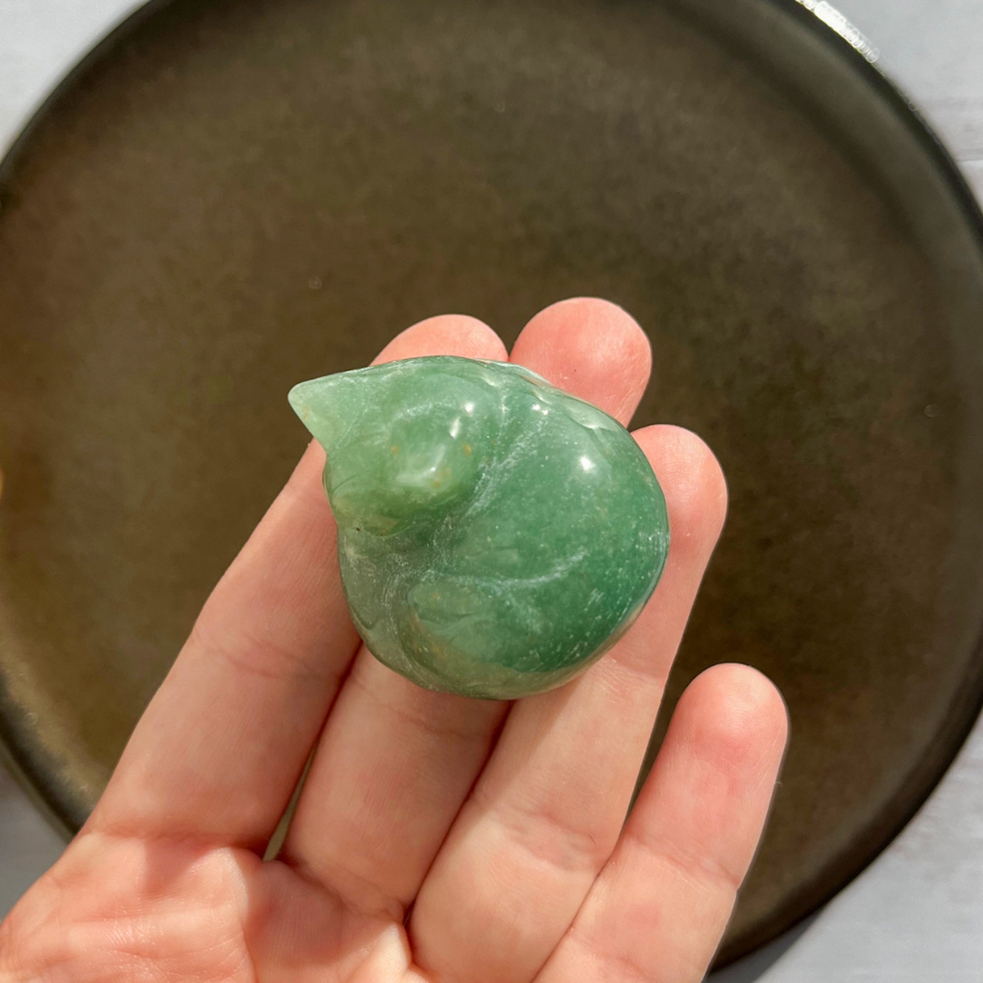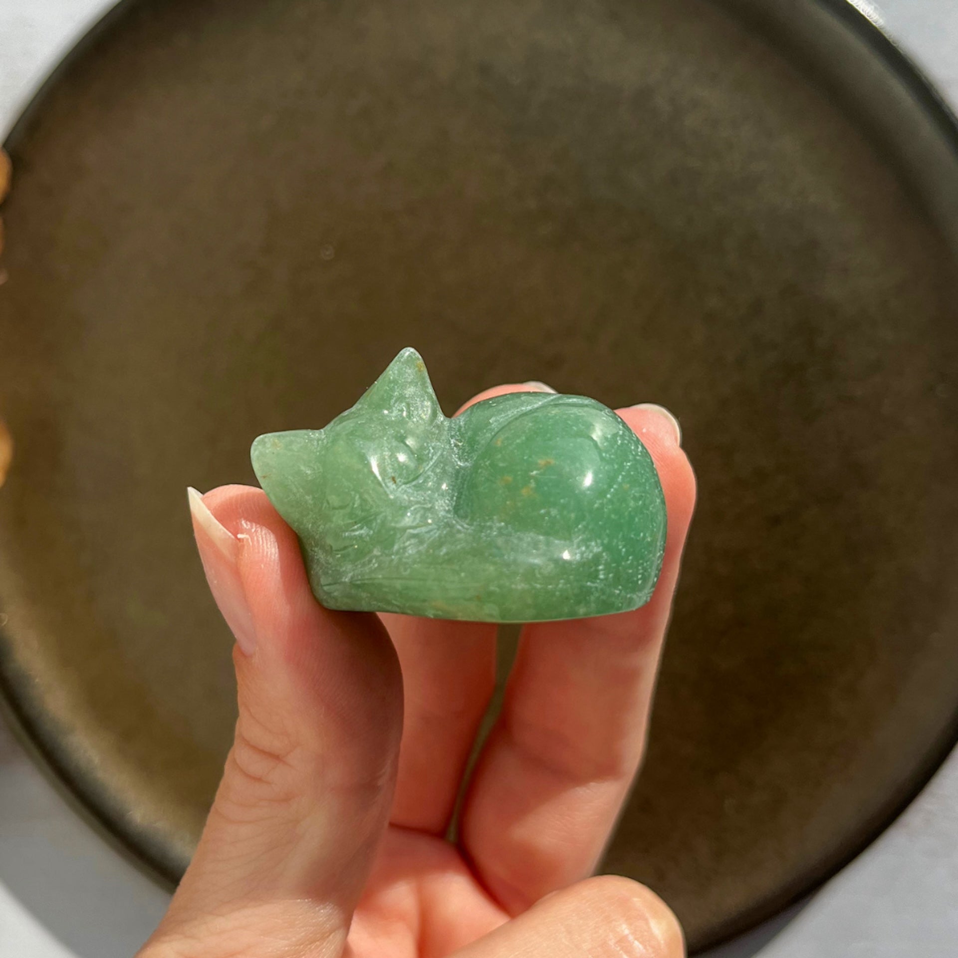 Når denne grønne sten tager form som en kat, forenes dens glædelige vibrationer med kattens symbolik af nysgerrighed, ynde og mod.