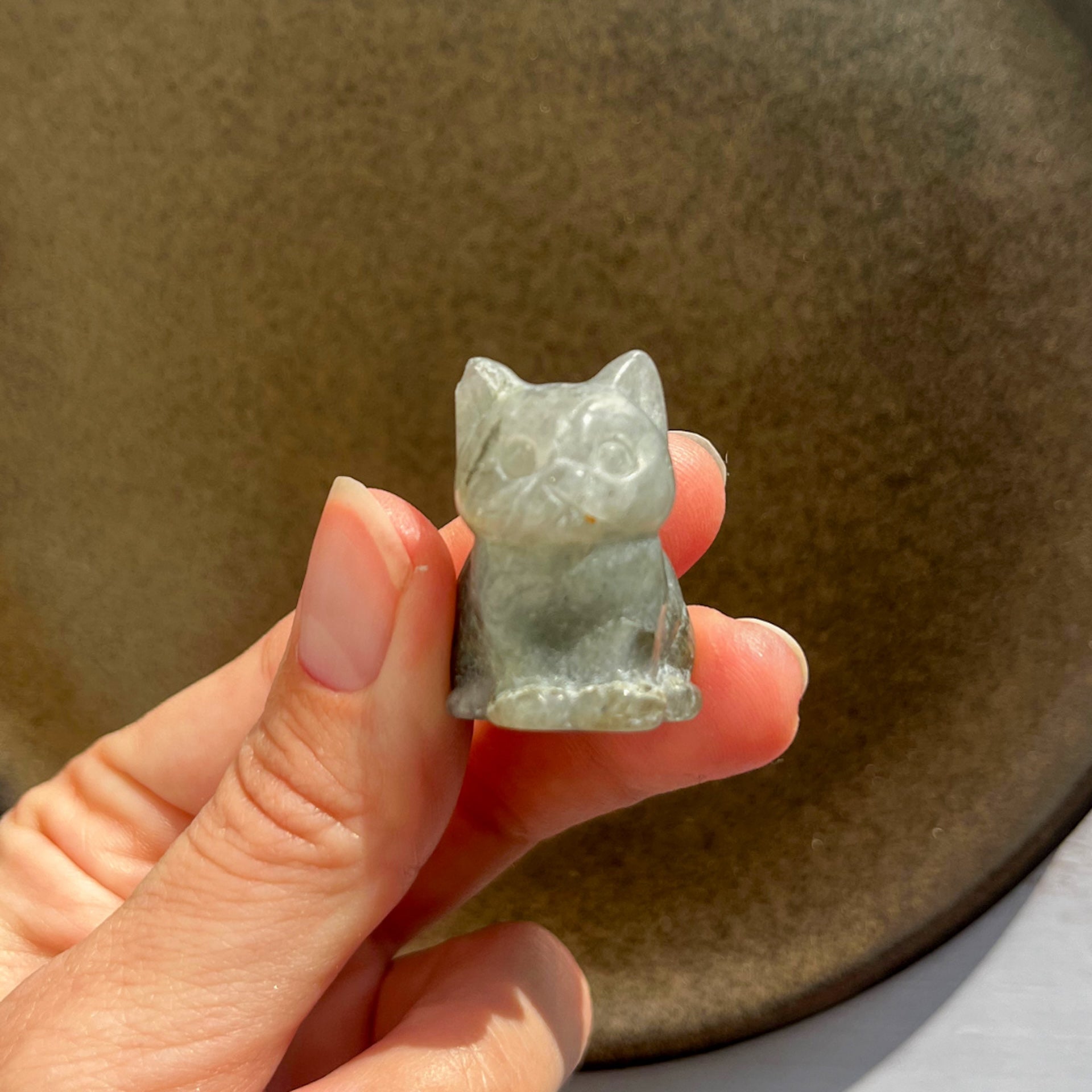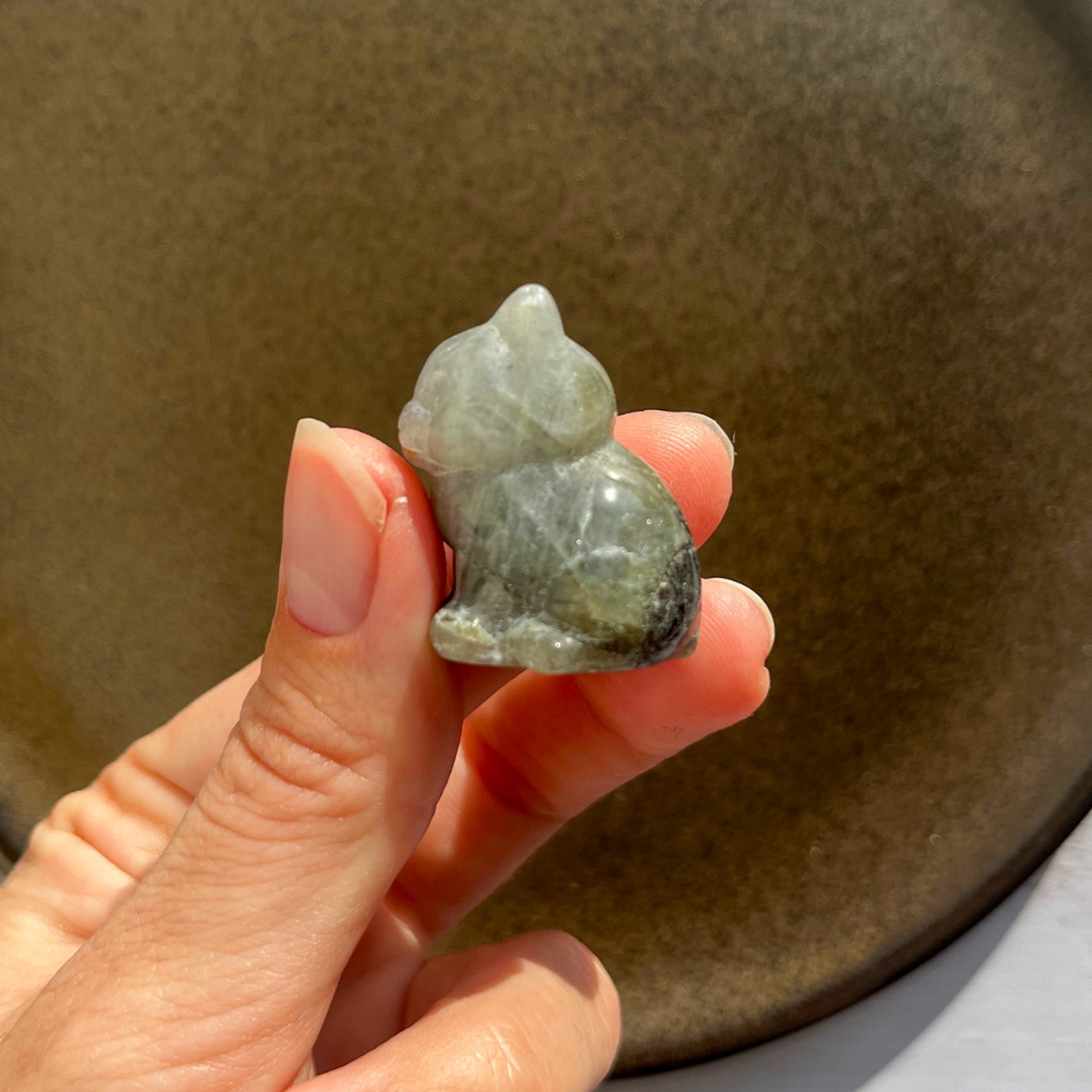 Når labradorit tager form som en kat, forstærkes dens kraftfulde energi med kattens symbolik af nysgerrighed og visdom.
