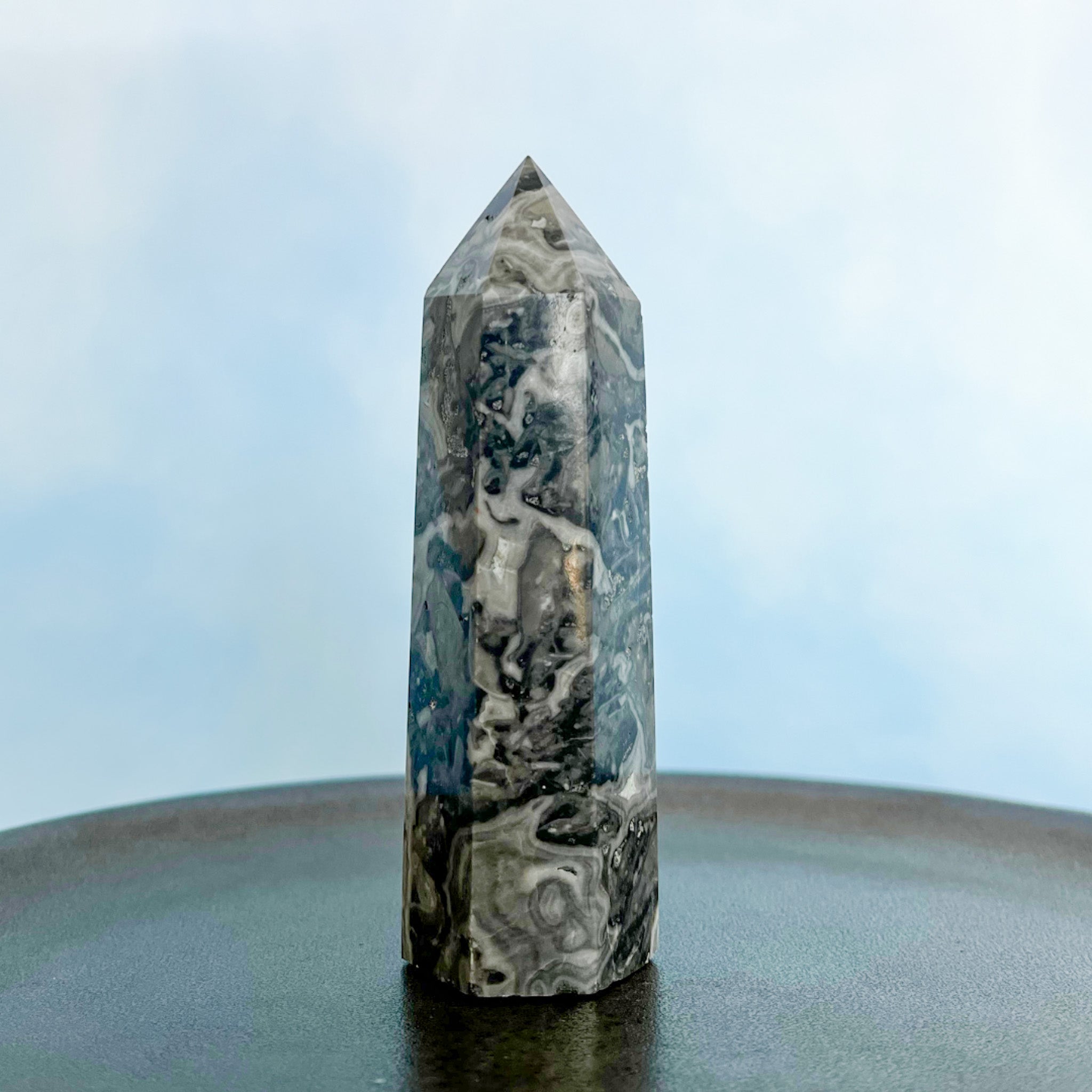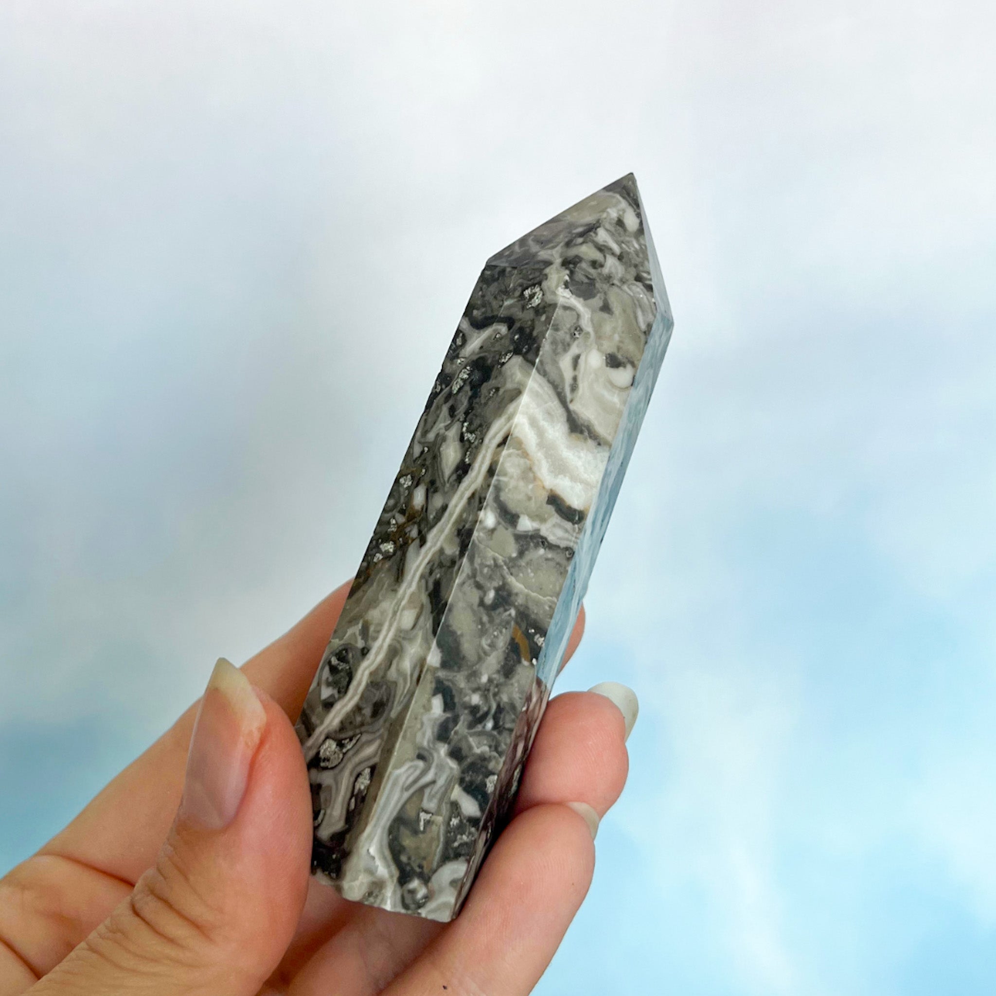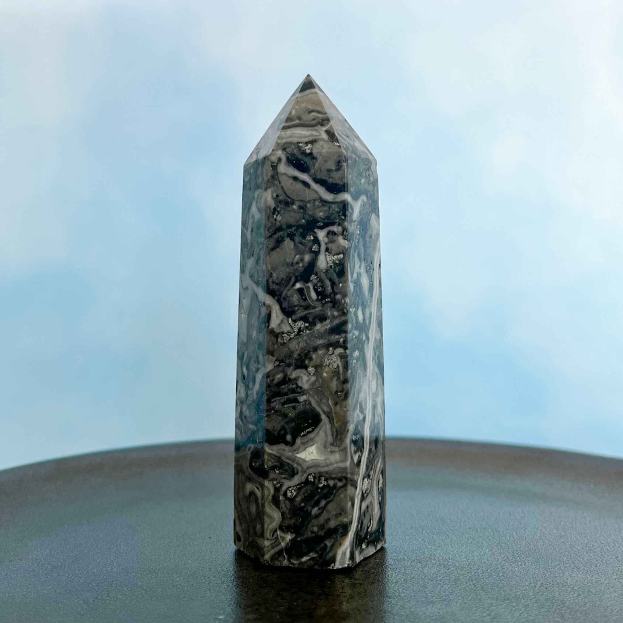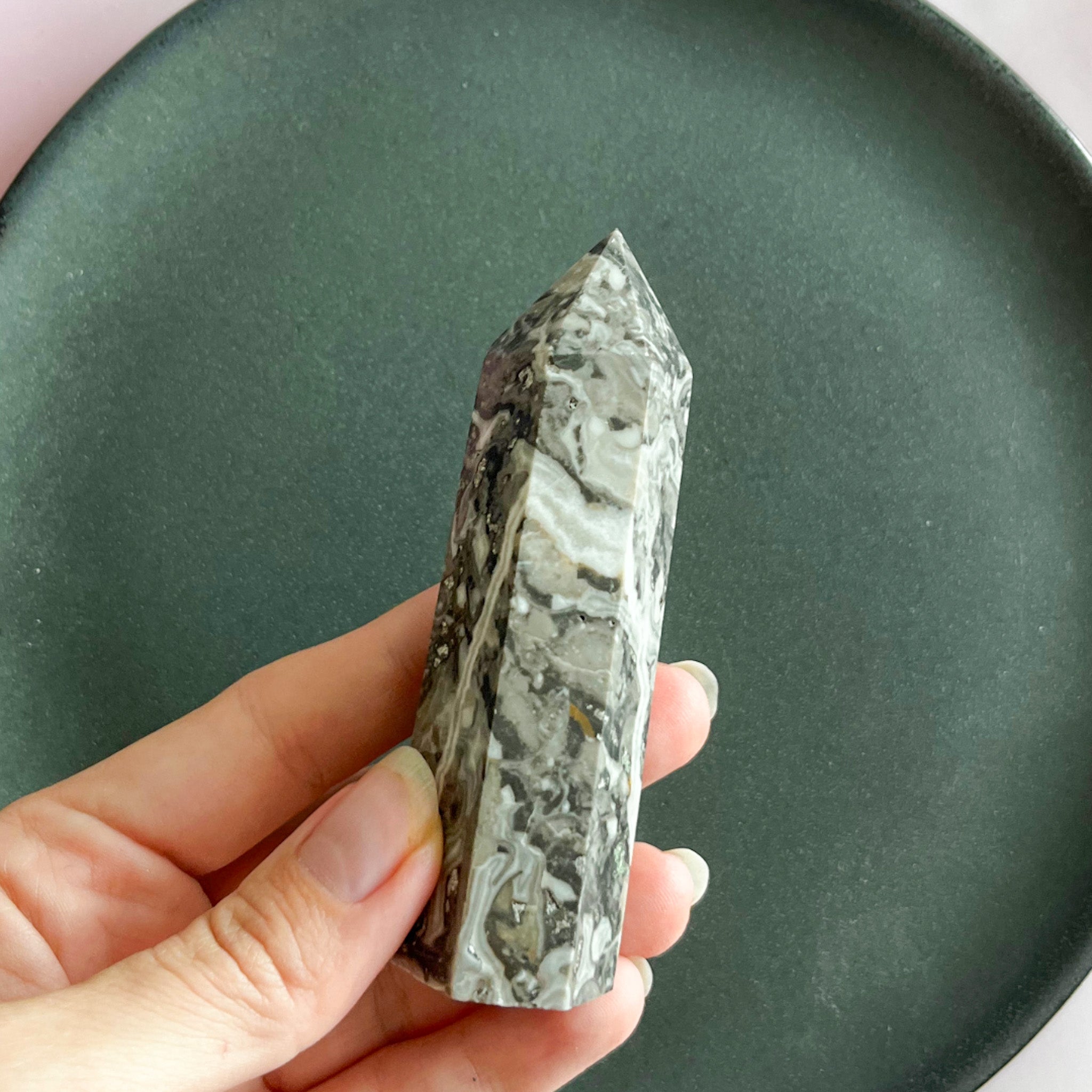 Dette smukke Picasso Jaspis tårn fanger øjet med sine fascinerende mønstre, der minder om abstrakte kunstværker – en krystal, der bærer sit navn med stolthed, som en hyldest til den ikoniske kunstner Picasso.