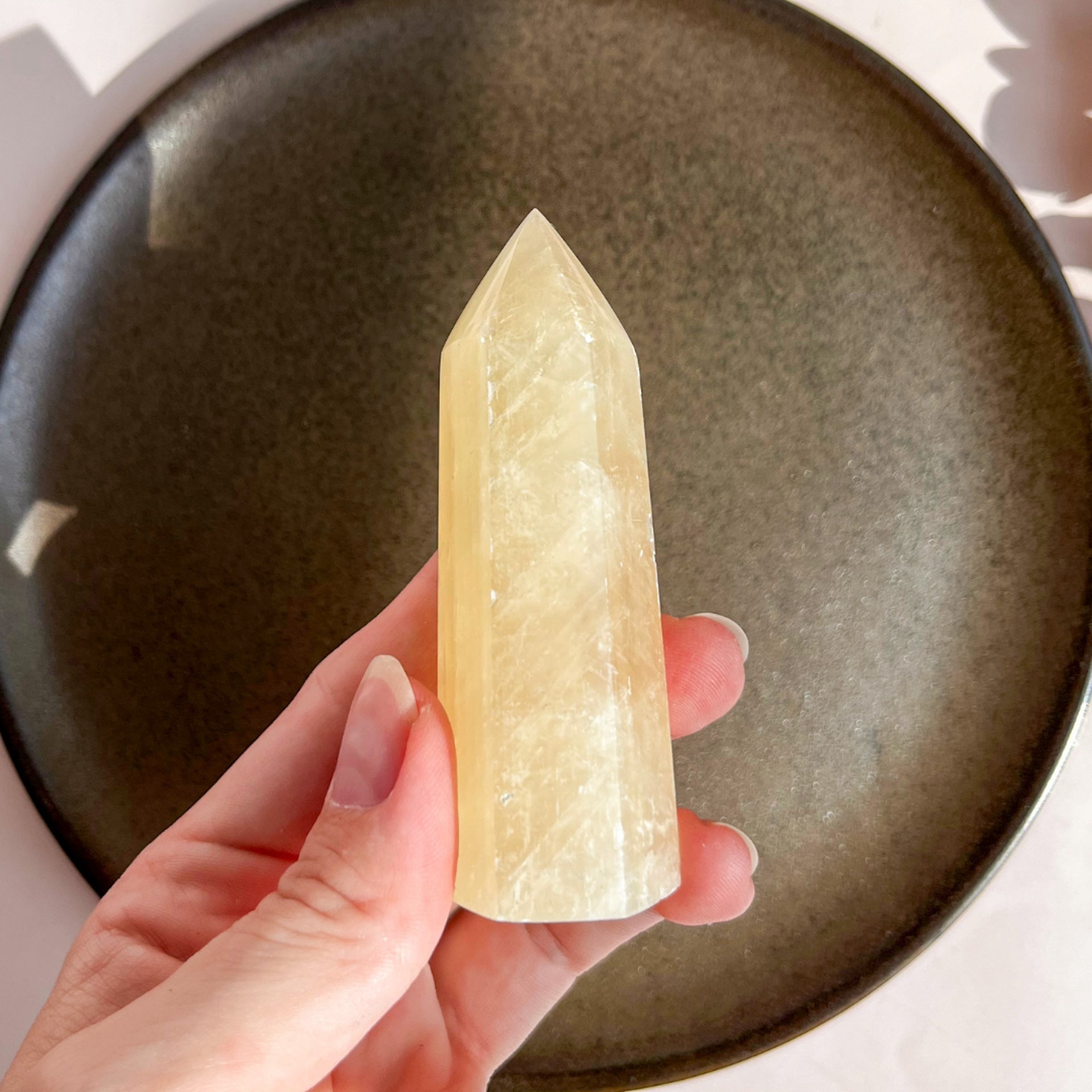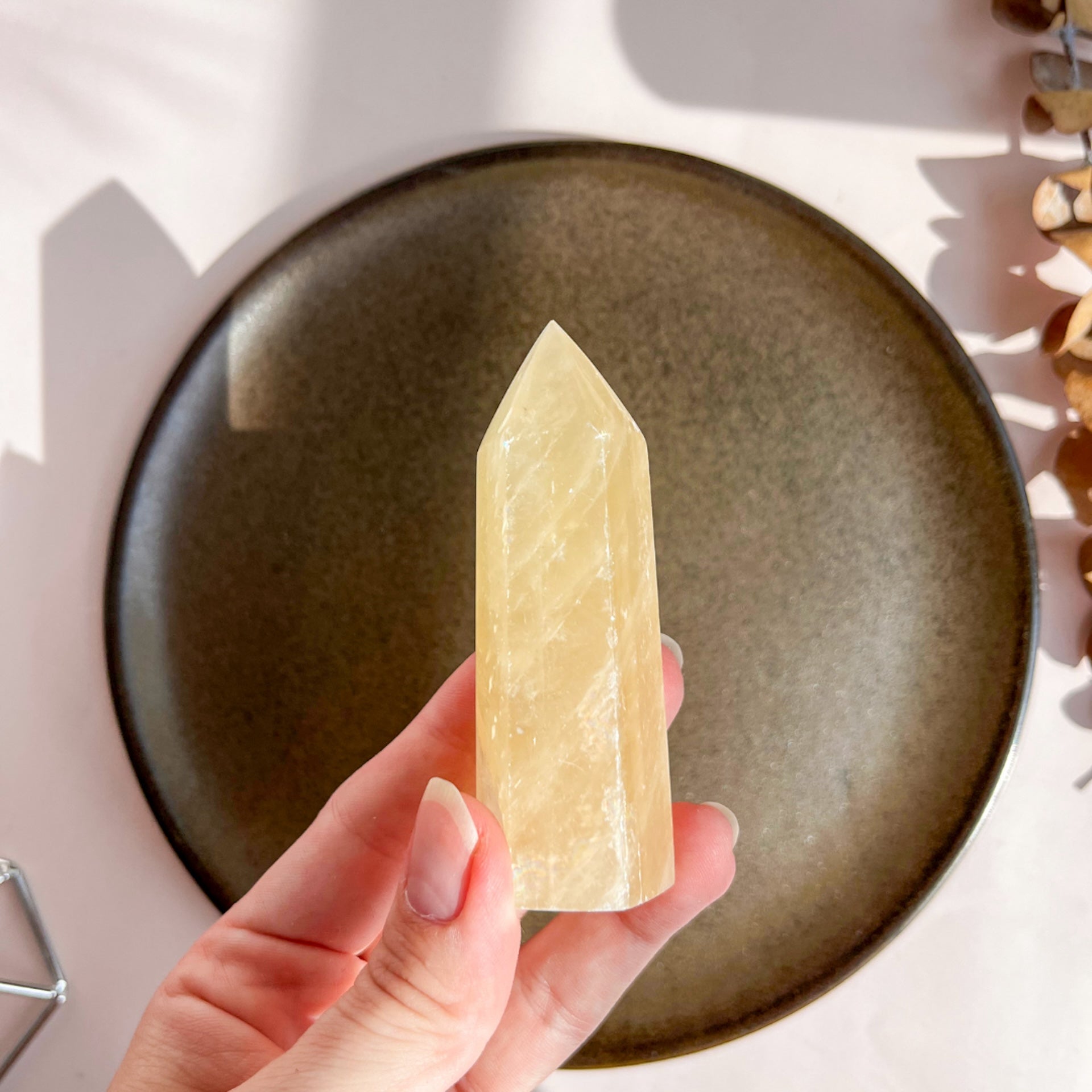Dette smukke honning calcit tårn er især forbundet med glæde og positivitet.