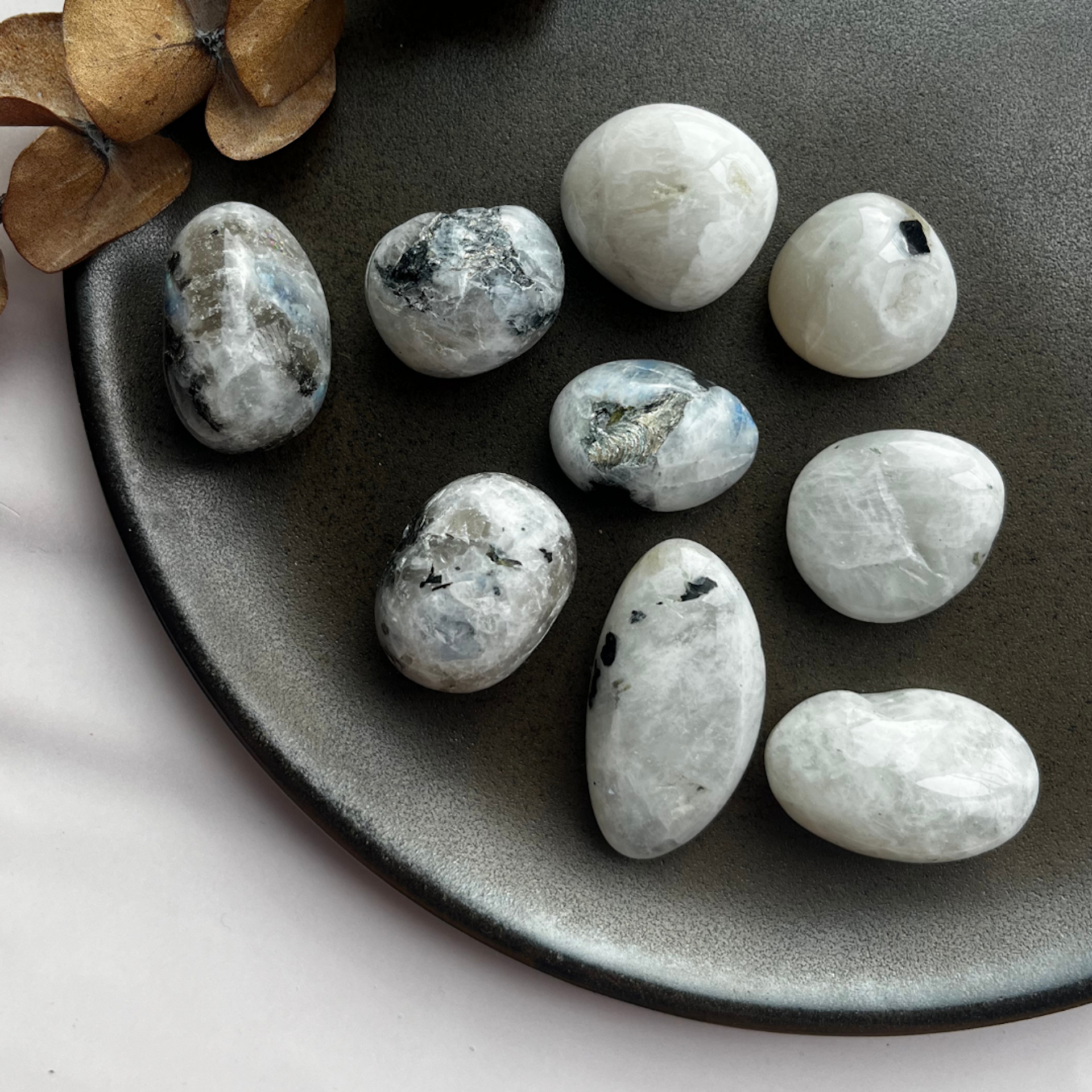 Vidunderlige månesten lommesten, der er kendt for at fremme blidhed, intuition og fertilitet.