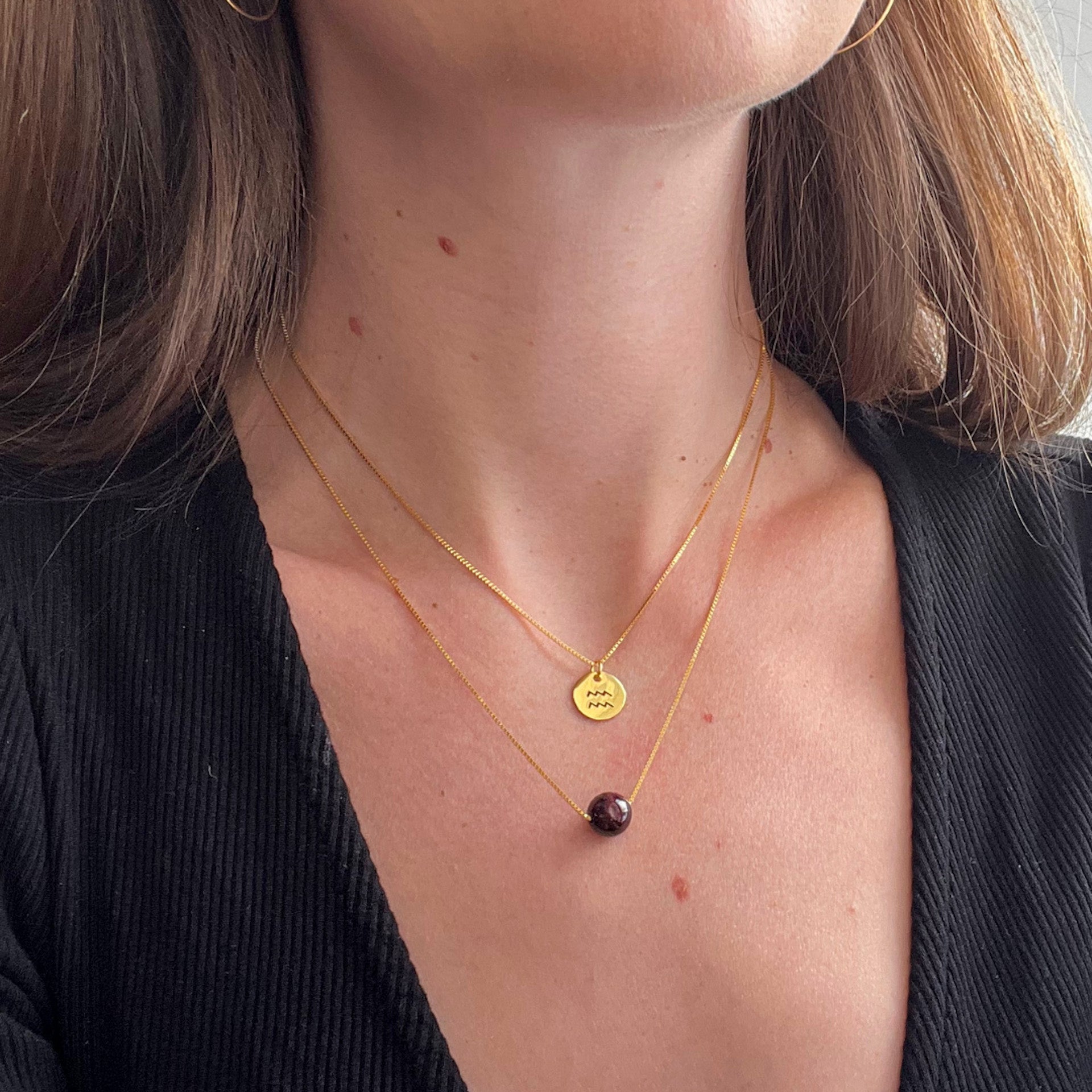 Derfor indeholder denne særlige halskæde en enkelt granatperle, der understøtter Vandbærerens naturlige tilbøjelighed til at udforske nye ideer og bringe forandring til bordet.