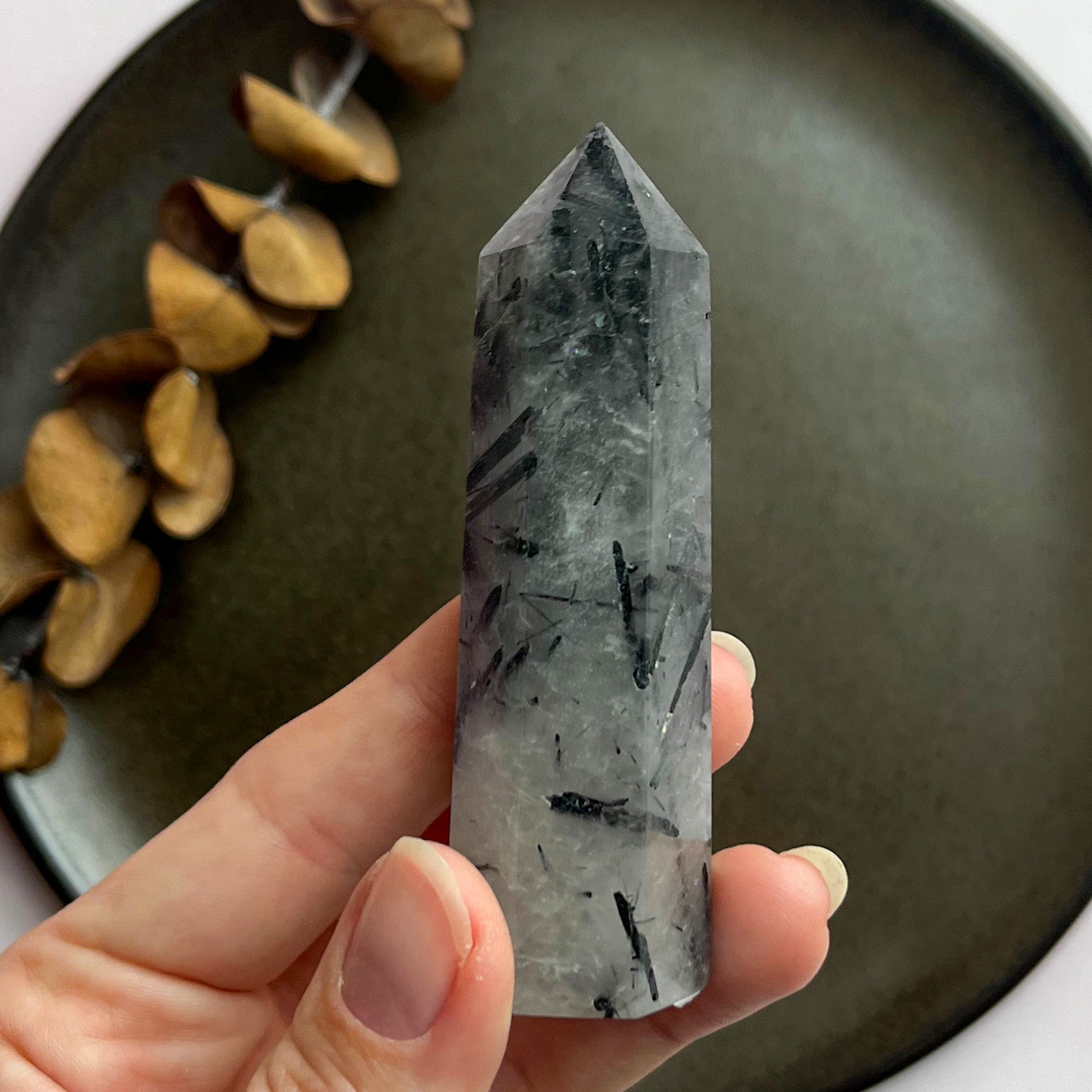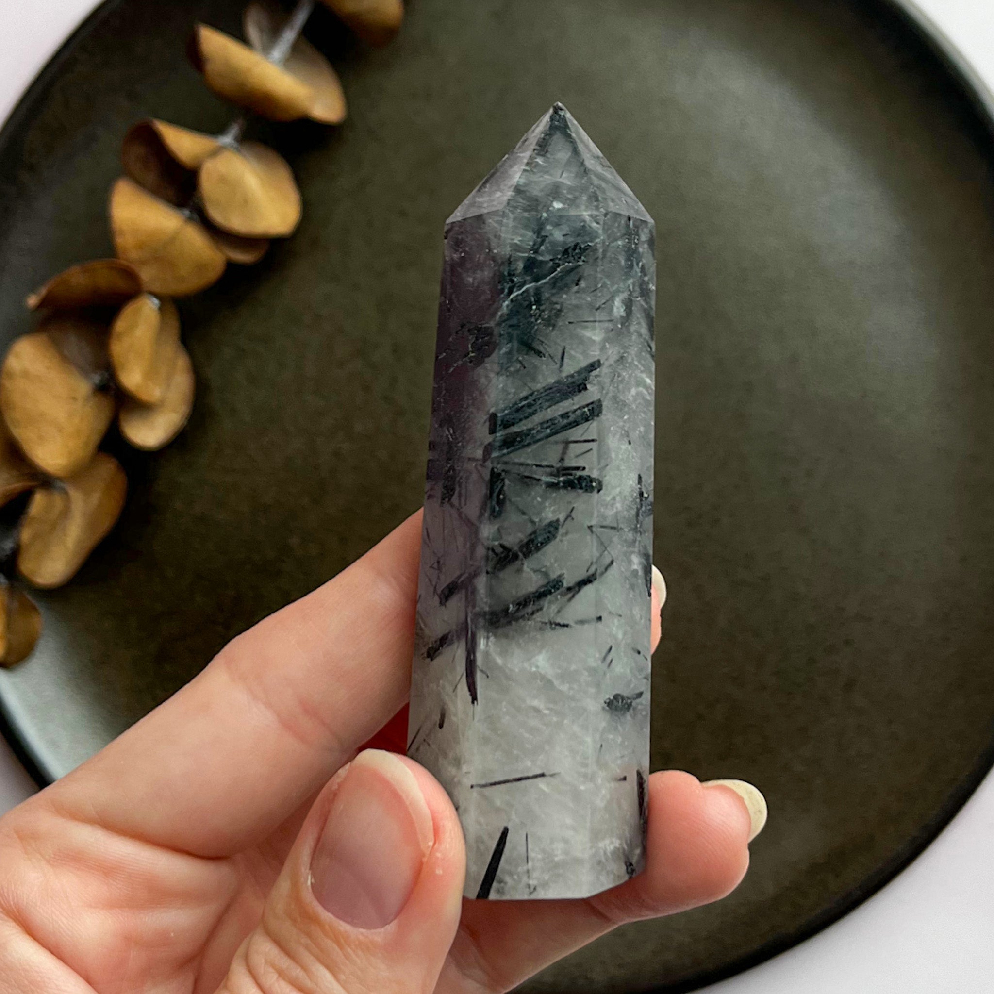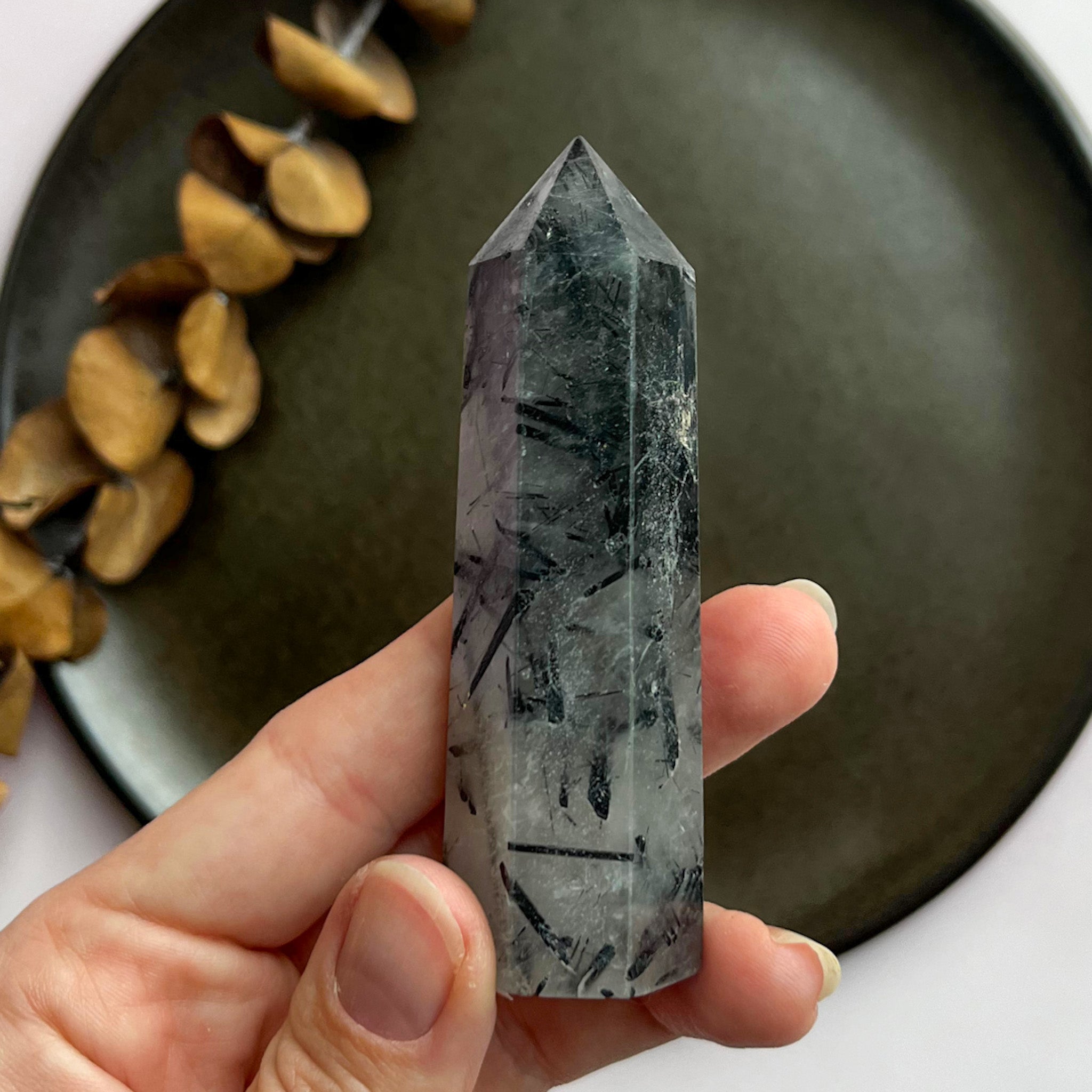 Turmalin kvarts er en fascinerende og visuelt slående krystal. Dette smukke tårn er ingen undtagelse med sin unikke sammensmeltning af sorte turmalin-inklusioner og klare kvarts, hvilket skaber et enestående landskab af kontrast og harmoni.
