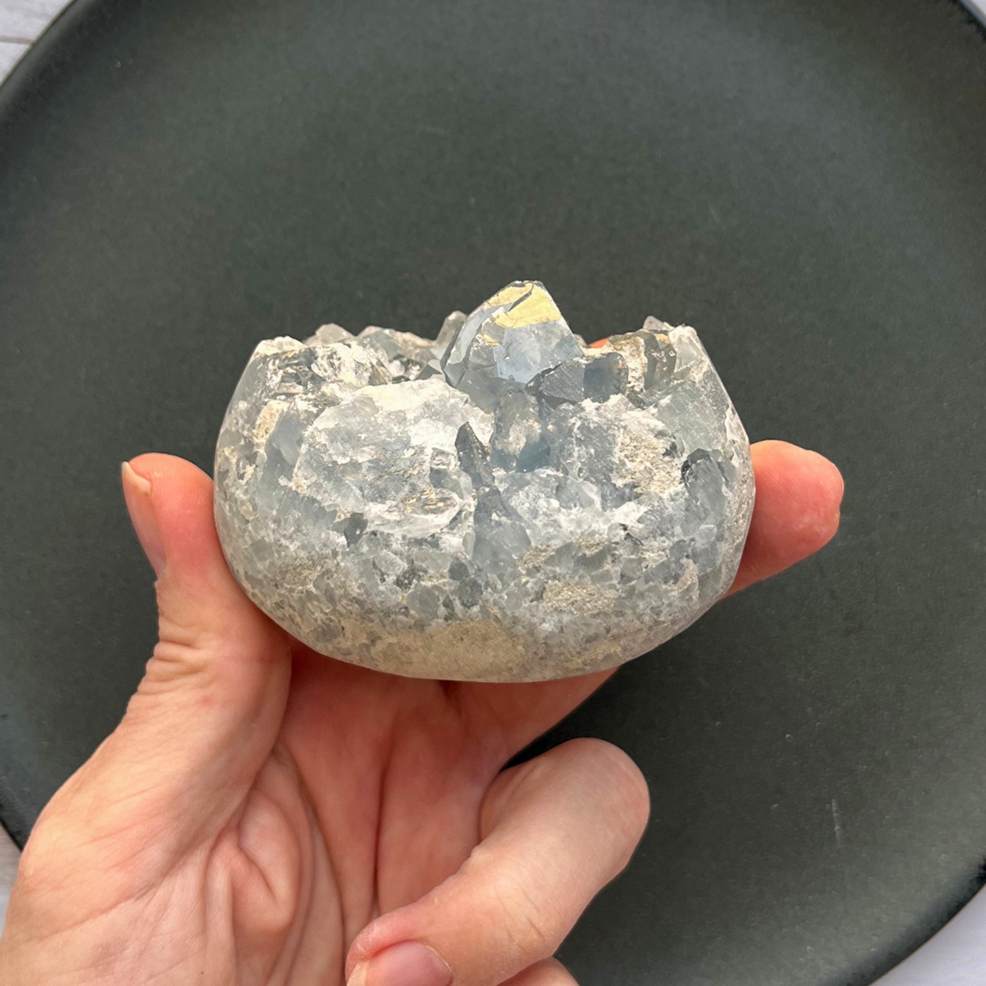Denne unikke celestit klynge viser krystallens skønhed og rå energi frem fra sin bedste side. En helt unik klynge, som vil gøre sig smukt i enhver krystalelskers hjem.