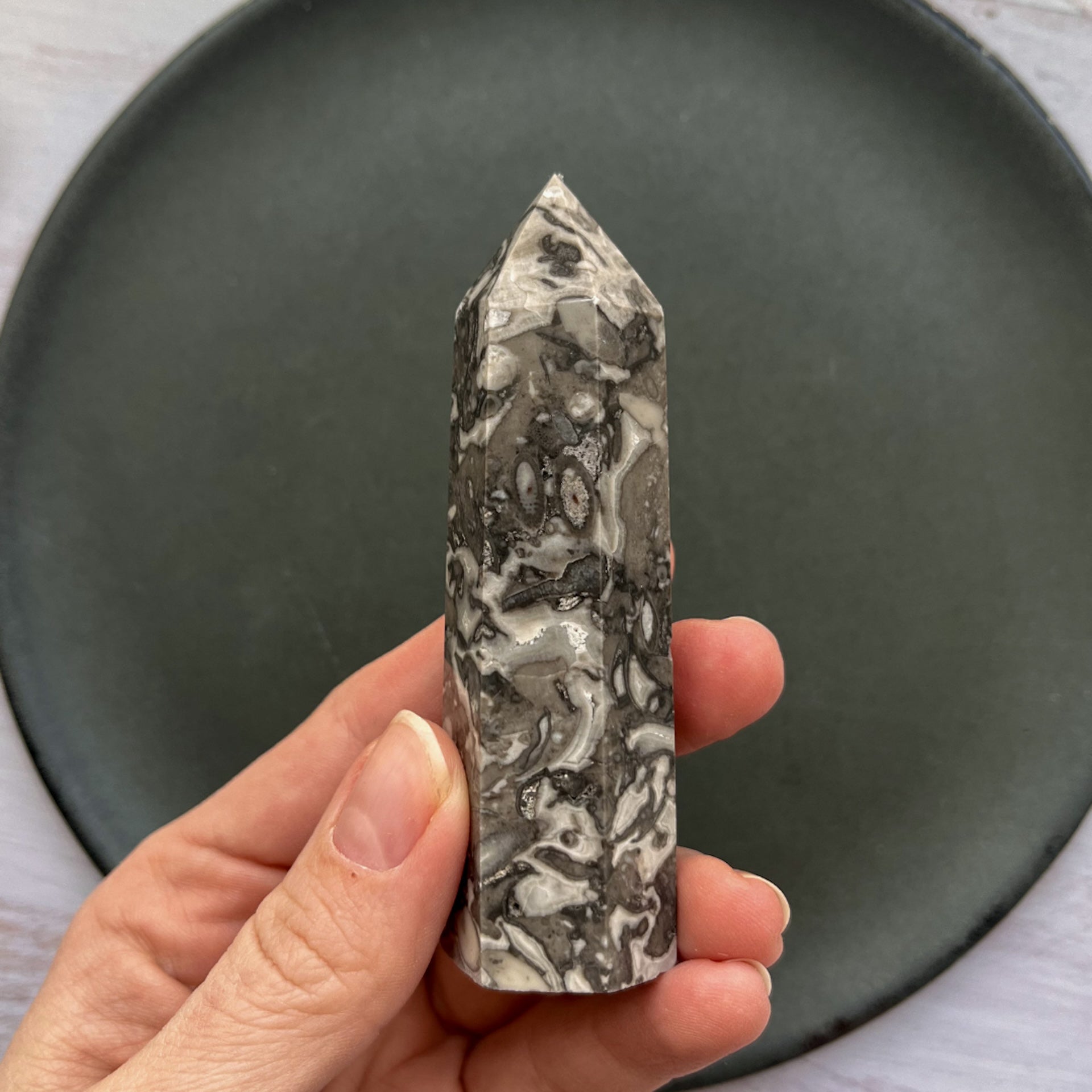 Dette smukke Picasso Jaspis tårn fanger øjet med sine fascinerende mønstre, der minder om abstrakte kunstværker.. En krystal, der bærer sit navn med stolthed, som en hyldest til den ikoniske kunstner Picasso.