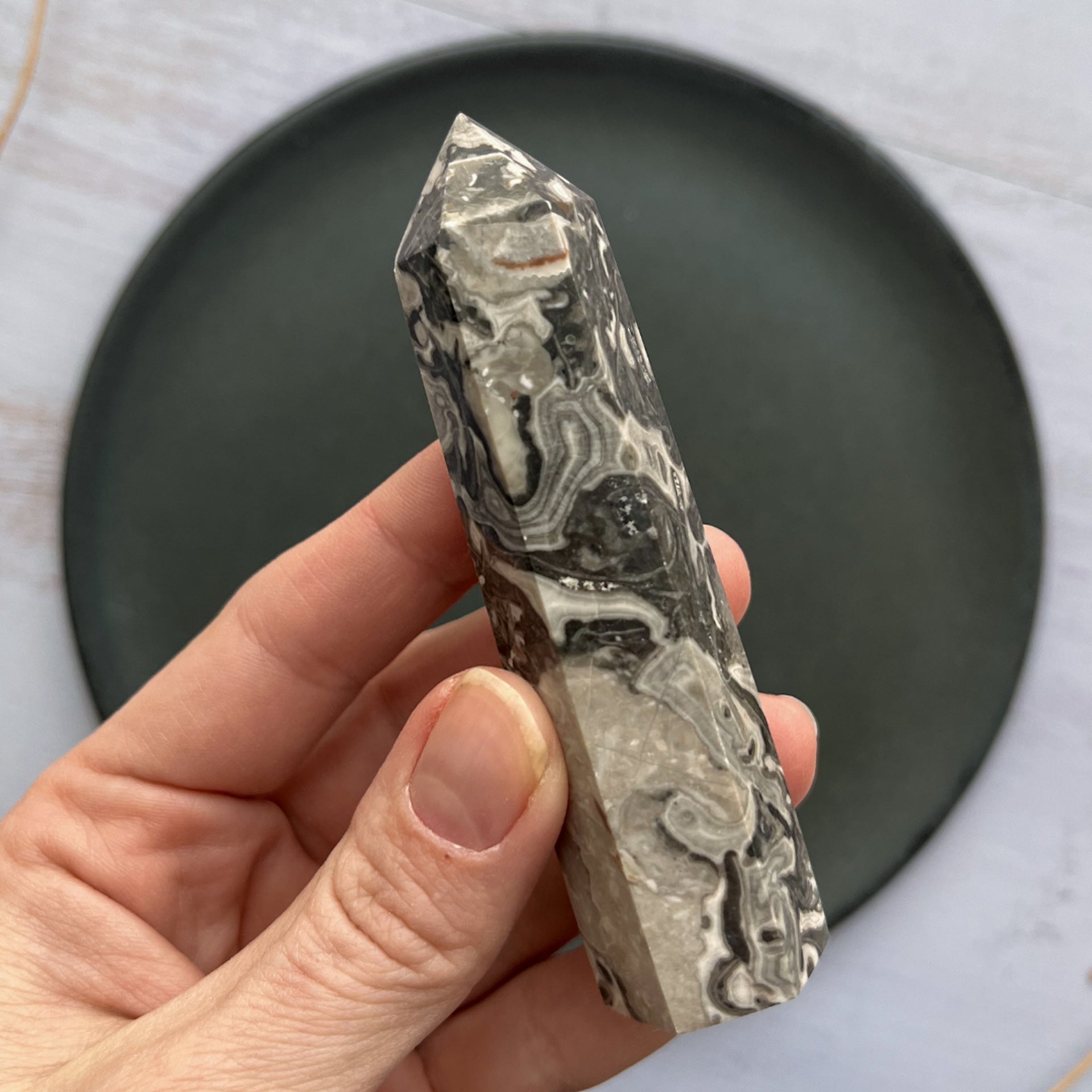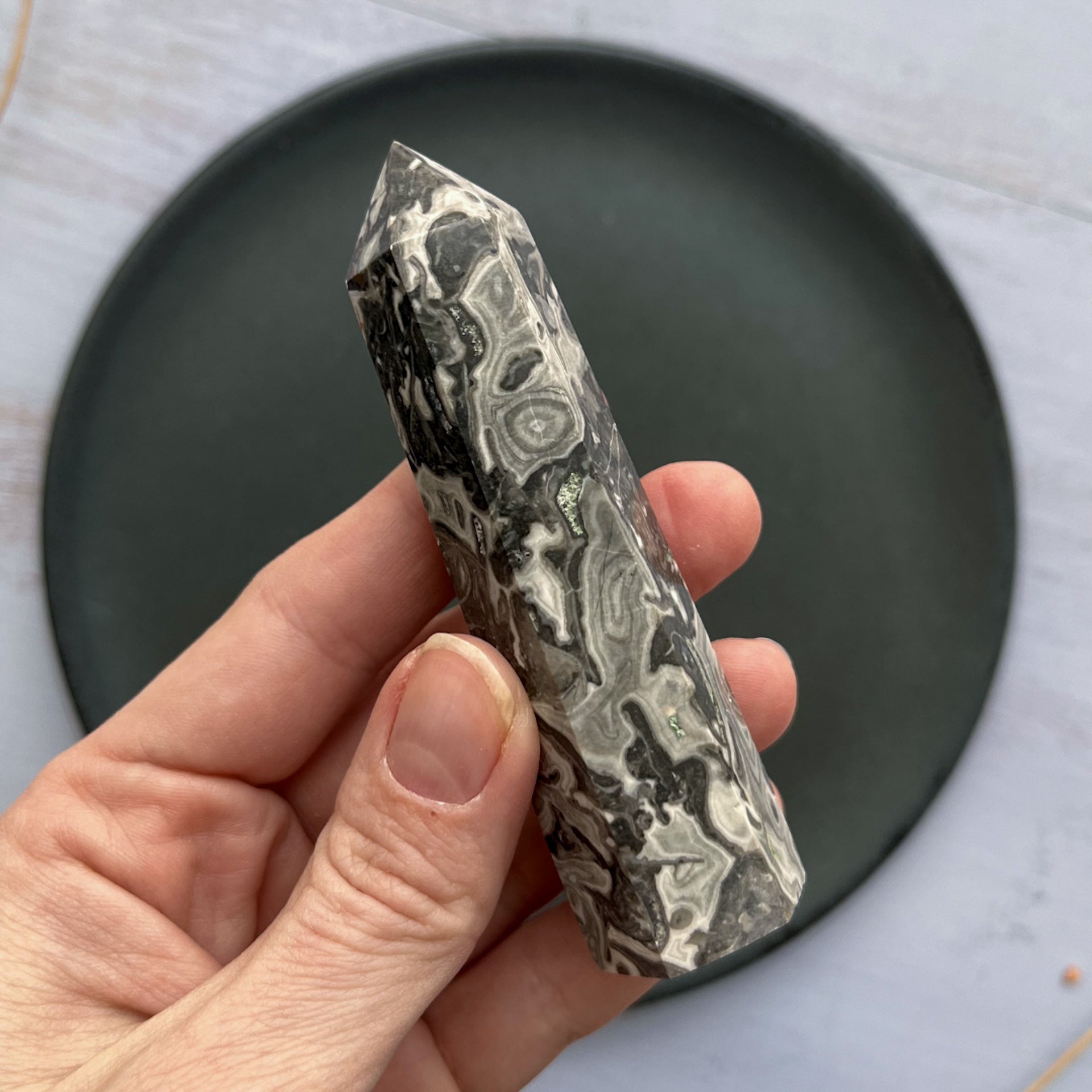 Dette smukke Picasso Jaspis tårn fanger øjet med sine fascinerende mønstre, der minder om abstrakte kunstværker.. En krystal, der bærer sit navn med stolthed, som en hyldest til den ikoniske kunstner Picasso.